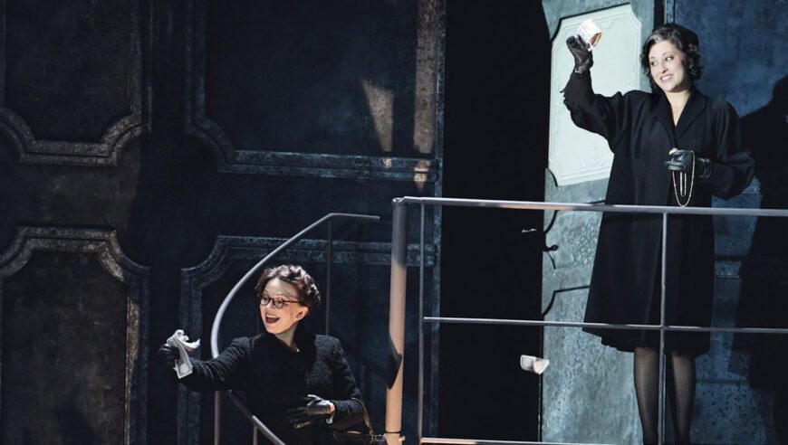 Eines haben die Kompositionen, die zur Spielzeiteröffnung nach langer, Corona-bedingter Pause an der Oper Frankfurt im Zusammenspiel mit Gian Carlo Menottis Oper „The Medium“ zu erleben sind, gemeinsam: Sie strahlen Hoffen, Trauer und Vergänglichkeit der menschlichen Existenz aus. Zu Beginn betreten rund dreißig Männer die Bühne. Der „Gesang der Geister über den Wassern“ für acht Männerstimmen und tiefe Streicher von Franz Schubert ertönt, gefolgt von Johannes Brahms „Vier Gesängen“ für Frauenchor, zwei Hörner und Harfe. Beide Werke sind reizvolle, Naturromantik atmende Stücke, die besondere Klangfinessen der begleitenden Musiker einfordern. Dies gelingt vorzüglich unter dem achtsamen Dirigat von Generalmusikdirektor Sebastian Weigle. Brahms „Vier Gesänge“ erinnern an Wagners Spinnerlied aus dem „Fliegenden Holländer“. Frisch, jung, beherzt und fast knabenhaft tönt der in lange, schwarze Samtkleider gehüllte Frauenchor. Chorleiter Tilman Michael kann aus dem musikalisch Vollen schöpfen. Gute Deklamation, Textverständlichkeit und wohl geformte Konsonanten zeichnen diesen Opernchor aus, trotz der Masken, die sie tragen müssen. Der Zuhörer begreift, dass Musik Seelensprache sein kann, ja ist! Intelligentes dramaturgisches Kombinieren von Einaktern mit Kompositionen des abendländischen Chorgesangs geben dem manchmal zu sehr aufs Schauen fokussierten Publikum die Chance zu einem neuen, achtvollen Hinhören. Befreite Klänge folgen bei Witold Lutosławskis „Musique funèbre“ für Streichorchester, entstanden 1958 im Gedenken an den großen ungarischen Komponisten Béla Bartók. Das Solocello erhebt die Stimme. Schluchzende Sekunden, aufbegehrende Quinten bestimmen das Beklemmung hervorrufende Stück.