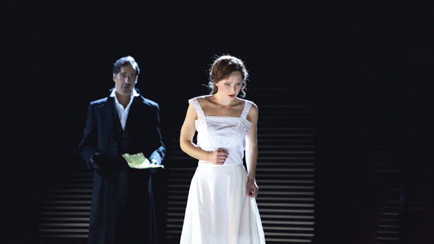 München hat eine Tradition mit speziellen Theaterformen: ein herrlich weites, edles Oval, in der zentralen Loge im Balkon ein paar Menschen, etliche weitere im weiten Rund – das waren die berühmten Separatvorstellungen für König Ludwig II. ab 1872. Ganz ähnlich wirkten jetzt die rund 300 Besucher der Premiere im Gärtnerplatztheater – eine kulturpolitische Absurdität im bis 2019 totalrenovierten Komplex mit der modernsten Lüftungsanlage aller Münchner Theater, während vollbesetzte Flieger vom Airport starten dürfen … Der dankbar herzliche Applaus schloss am Ende alle mit ein, auch wenn das Bühnenteam hörbar schwächeren Beifall registriert haben sollte. Das lag nicht an den Corona-Vorgaben, speziell den Distanz-Vorschriften für alle Bühnenfiguren. Regisseur Ben Baur hatte in Uta Meenens Kostümen das Werk in der zaristischen Gesellschaft angesiedelt, wo „Distanz“ zur gesellschaftlichen Konvention gehörte. So sangen die Bauernchöre schön brav und breit aufgestellt und ein Walzer wie eine Polonaise in St. Petersburg können ja durchaus mal mit sehnsuchtsvoll ausgestreckten Armen, aber ohne Handberührung getanzt werden (Choreinstudierung: Felix Meybier; Choreographie: Lillian Stillwell). Auch in der „Liebe“ galten ja Zucht und Ordnung, was Olga und Lenski temperamentvoll, Tatjana und Onegin weniger überzeugend steif vorführten. Wenn Baur das Ganze als Tatjanas „Traum zurück“ – von der ersten Pose im Vorspiel bis zur Schlussszene einschließlich irrealer Auftritte eines Tatjana-Kindes – zeigen wollte, dann blieb seine Lichtregie mit Michael Heidinger zusammen banal bis „nicht existent“, sein eigenes Bühnenbild spielte keine Rolle.