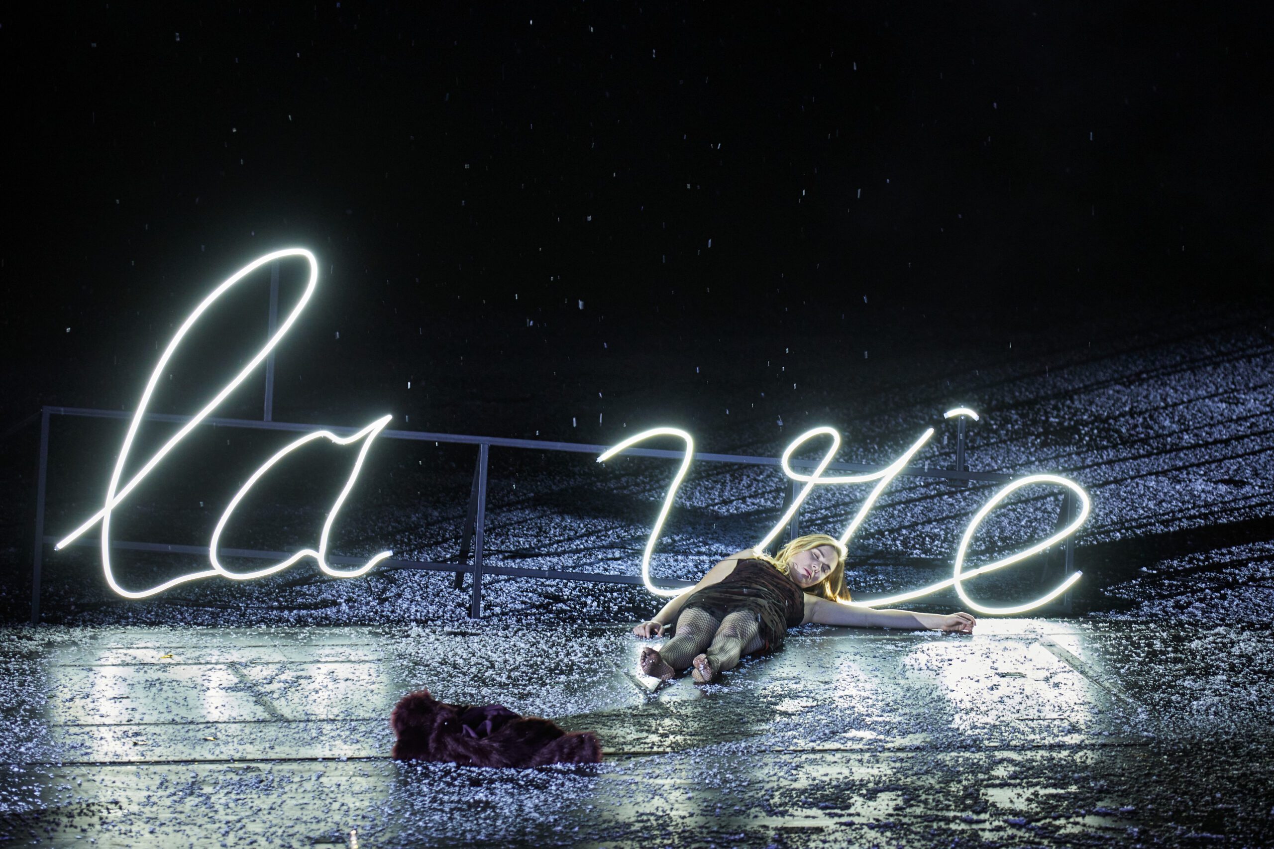 Regisseur David Bösch nutzt die Corona-Vorgaben und zeigt Menschen oft auf Distanz mit der Sehnsucht nach Nähe. Es sind Menschen in einem zeitlosen Jetzt und Hier und Heute. So genügen ein paar Stühle und Tische auf sonst leerer Bühne für die Erstbegegnung im Wirtshaus, dann für das sehr schlichte Liebesnest in Paris. Kontrastreich fulminant ist Bühnenbildner Patrick Bannwart und Kostümbildner Falko Herold Manons „Erfolg“ in der Welt des „Glitter and be gay“ gelungen: als Shootingstar im Showgeschäft, alles unter der Leuchtschrift „C’est la vie“, alles glamouröse Oberfläche – dahinter die Glücksuche an einarmigen Banditen, wo sich die nicht so glücklichen, daher sich sexy anbietenden „Freundinnen“ Poussette, Javotte und Rosette tummeln. Dass die dann doch zu zarte Manon noch einmal das Glück bei Des Grieux sucht, ihn aus seiner religiösen Zuflucht herauslockt: All das überzeugt szenisch wie musikdramatisch. Nach dem kurzen Glückspiel-Irrglauben lässt Bösch dann alles in einer leeren Öde enden, wo Massenet Manon im Gefangenentransport nach Le Havre an Erschöpfung sterben lässt. Doch Bösch muss da ärgerlicherweise wieder seine „eigene Sicht“ zeigen: Manon kommt wie am Anfang mit ihrem kleinen Rucksack und trinkt Gift, noch dazu aus einem Fläschchen, das eher aus dem 19. Jahrhundert stammt – Massenet ver-schlimm-bessert! Interpretationsgewinn: null!