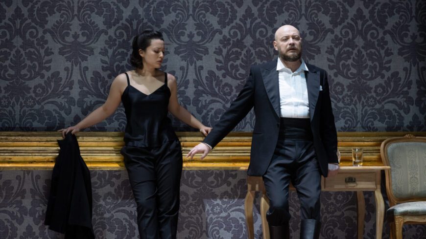 In einem edel blau tapezierten Salon sitzt Mariusz Kłubczuk am Flügel und intoniert zur Einstimmung einige Takte aus Tschaikowskis „Dumka“. An einem Tischchen sitzt versunken der männlich reife Vladislav Sulimsky, singt sich selbst mit bassbaritonaler Wucht „Schlaf ein, mein Herz … was vorbei ist, ist vorbei“ versöhnlich Ruhe zu. Der jugendlich agile Bariton Mikołaj Trąbka versinkt in seligem Überschwang und erster Pein – wozu der reife Mann wissend lächelt. Tenor Andrea Carè als „Mann im besten Alter“ besingt derweil das „schnelle Vergessen“. Wie die drei einander betrachten, sich abwenden, dann wieder zuhören: Da tut sich bereits eine Bandbreite von menschlicher Diversität und Ähnlichkeit auf, die in Bann schlägt. Das vertieft Mezzosopranistin Kelsey Lauritano im Hosenanzug, denn nicht das weibliche Element kommt hinzu, auch eine andere Art von Trauer. Zum kleinen Klaviertriller erscheint Sopranistin Olesya Golovneva im weißen Tüll-Glockenrock und singt mit ihrer dunklen Partnerin von schmerzlich erbetener Ruhe; als der junge Bariton (Mikołaj Trąbka) voller Emphase von der Nachtigall und ihrem Zauberwort „Liebe“ schwärmt, erhebt sie sich auf Spitzen und beschwört mit wenigen Tanzfiguren die träumerische Aura all jener Schwanenwesen. Es gehört zum Besonderen, dass sich zwischen allen fünf Menschen ein feingesponnenes Beziehungsgeflecht mal andeutet, mal auftut, mal zerfällt. Doch auch hochdramatische Züge fehlen in Tschaikowskis Romanzen nicht: die volltönende Erinnerung an „Trunkene Nächte“ oder auch der Kosak, der seiner Hanna eine Korallenkette aus dem Krieg bringen soll und als er endlich heimkehrt, ist sie schon verstorben …