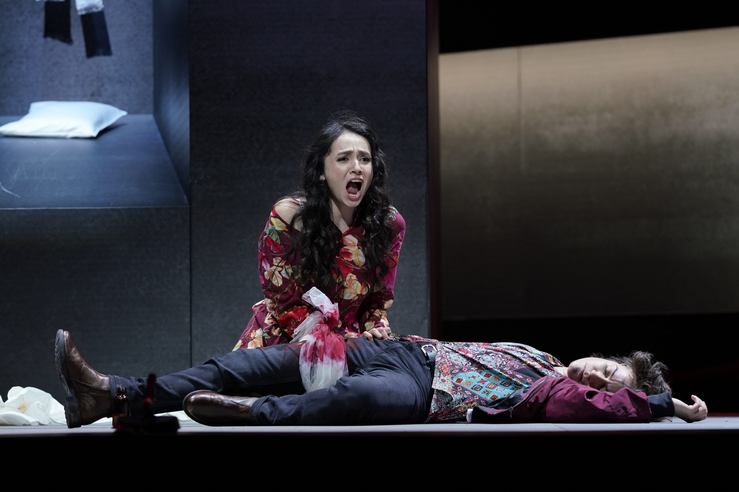 Regisseur Gregor Horres siedelt die auf Krawall gebürstete Familie vor einem anthrazitfarbenen, sich drehenden Betonquader an, der als Projektionsfläche für ein Video, eine Cocktailbar, ein Schlafzimmer und schließlich eine Grabkammer dient. Das Bühnenbild von Elisabeth Pedross unterstreicht die erstarrten Ansichten dieser Männergesellschaft, die, wenn gar nichts geht, nach Rache und Krieg schreit. Rache, weil Romeo, Sohn der feindlichen Montecchi, den männlichen Nachkommen der Capuleti in einer Schlacht erschlug. Tebaldo kämpft an vorderster Reihe als Rächer – vor allem, weil er als Preis seines Erfolgs die Heirat mit Giulietta erwarten darf. Tenor Joshua Whitener gibt den aalglatten Karrieremann, schafft es aber mit seiner Stimme, seiner Liebe zu Giulietta große Glaubhaftigkeit zu verleihen.