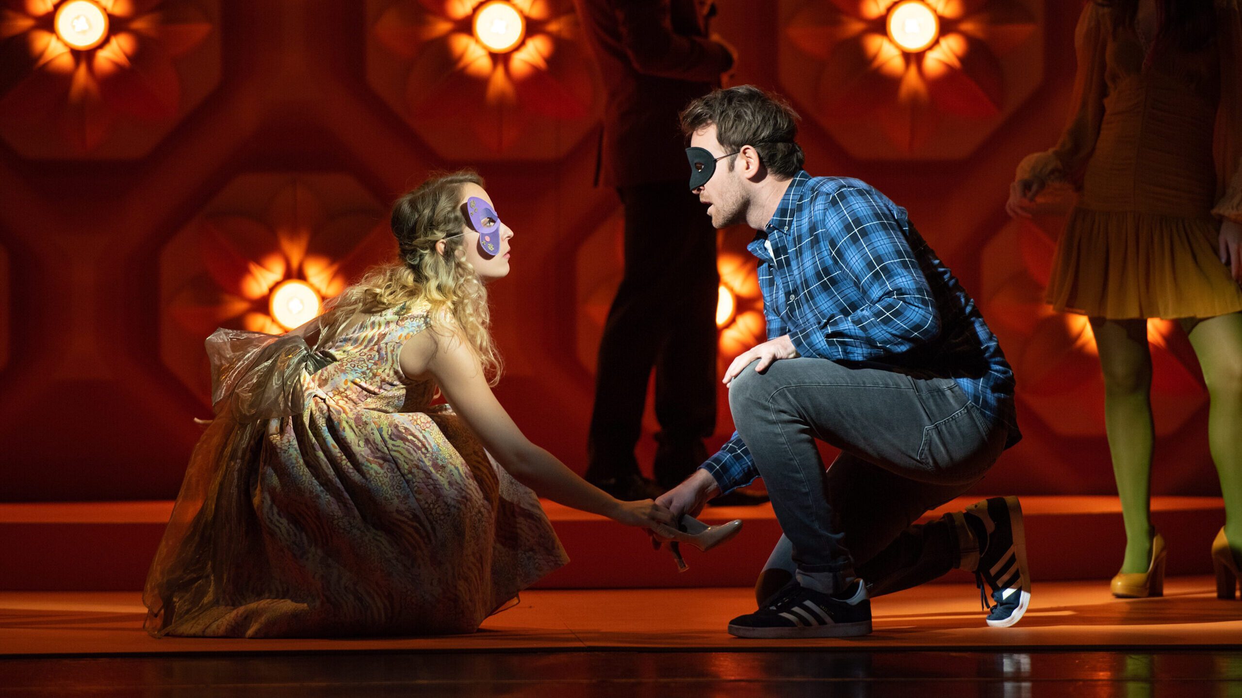 Dass der Abend im besten Wortsinn etwas Märchenhaftes hat, liegt gewiss nicht am harten Kulturentzug. Die wohltuend belebende, zauberhaft berührende und mit feingeschliffener Situationskomik gewürzte „Cinderella“ wurde am Ende verdient mit Standing Ovations geehrt. Deutscher verlegt die Handlung in die Welt der Musik: In einem Opernhaus, ehemals von Cinderellas Vater geführt, herrscht die intrigante Stiefmutter (Anne-Fleur Werner). Cinderella, eine begabte Komponistin, trägt wunderschöne Melodien in sich, für die sie, statt Anerkennung und Förderung, Spott und Missgunst erntet. Die beiden Stiefschwestern (Laura Nicorescu und Olivia Cosío) sind Meisterinnen im Nerven und Mobben, talentfrei, hübsch, aber auf lächerliche Art divenhaft. Weil der gesundheitlich angeschlagene König des Regierens müde ist, soll der Prinz auf Brautschau gehen. Doch der lässige Thronfolger im Holzfällerhemd will nicht unbedingt eine Standesgemäße. Seine große Liebe, „die rechte Braut“ also, soll musisch veranlagt sein – er selbst ist ein begabter Dichter. Nicht am passenden Schuh, sondern an der zu seinem Gedicht passenden Melodie will er sie beim schrill-schrägen Maskenball mit Gesangswettbewerb „erkennen“. Eine gute Fee (Maria Polańska) macht’s möglich, dass auch Cinderella ihre Chance bekommt. So nimmt, wenn auch auf Umwegen, das (Liebes-)Glück seinen Lauf.