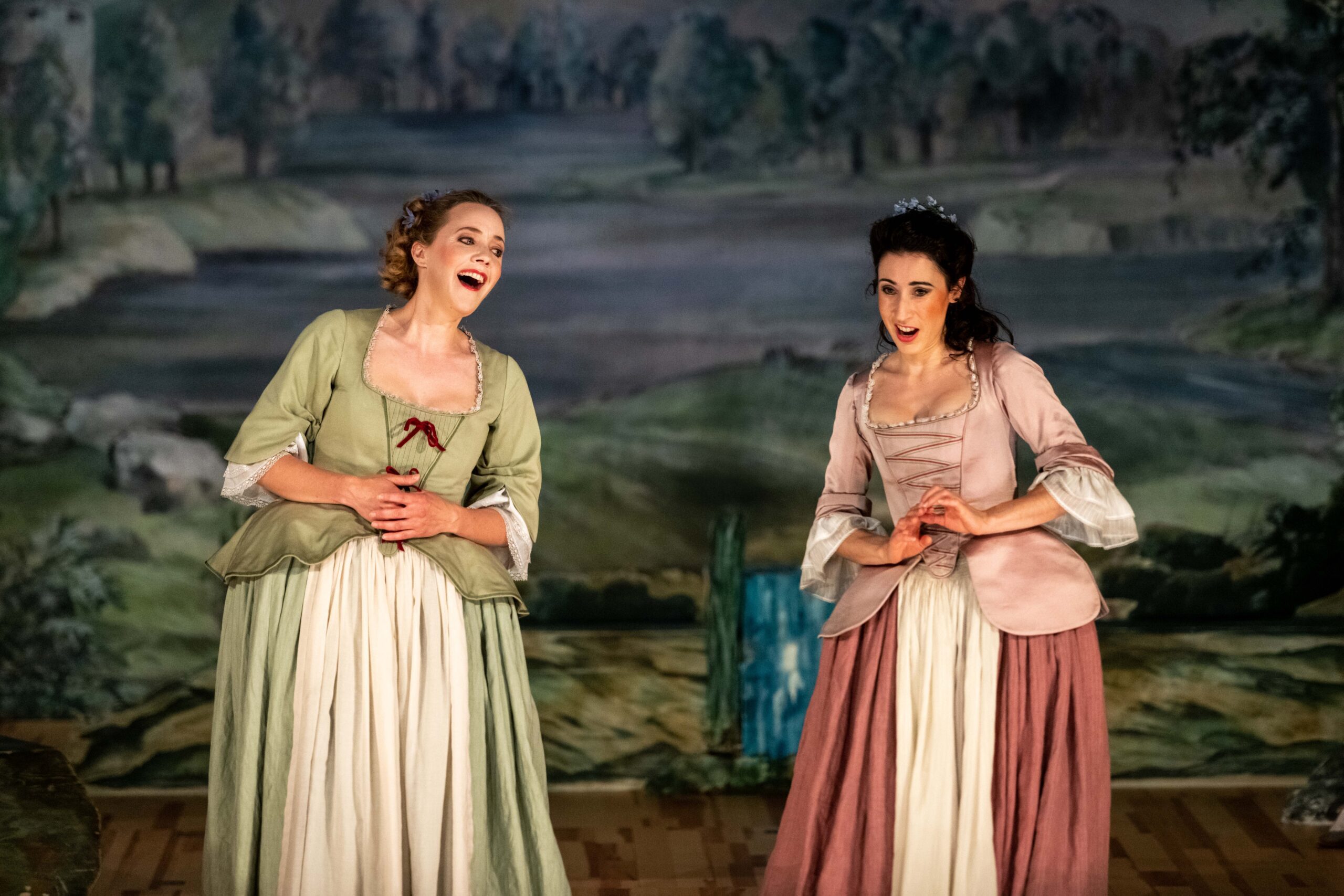 Die erst Anfang 2000 in einem Archiv in Kiew aufgefundene Partitur ist eine musikalische Köstlichkeit mit französischem Einschlag und reizvoll instrumentierten Arien, die je nach Gefühlslage das idyllische Geschehen abbilden. Die bukolische Stimmung wird durch die von Johannes Ritter entworfenen Landschaftsprospekte und die in Naturtönen gehaltenen Kostüme perfekt illustriert. Auf Harmonie setzt auch Nils Niemann in seiner hübsch arrangierten Inszenierung, die historische Bewegungselemente miteinbezieht.
