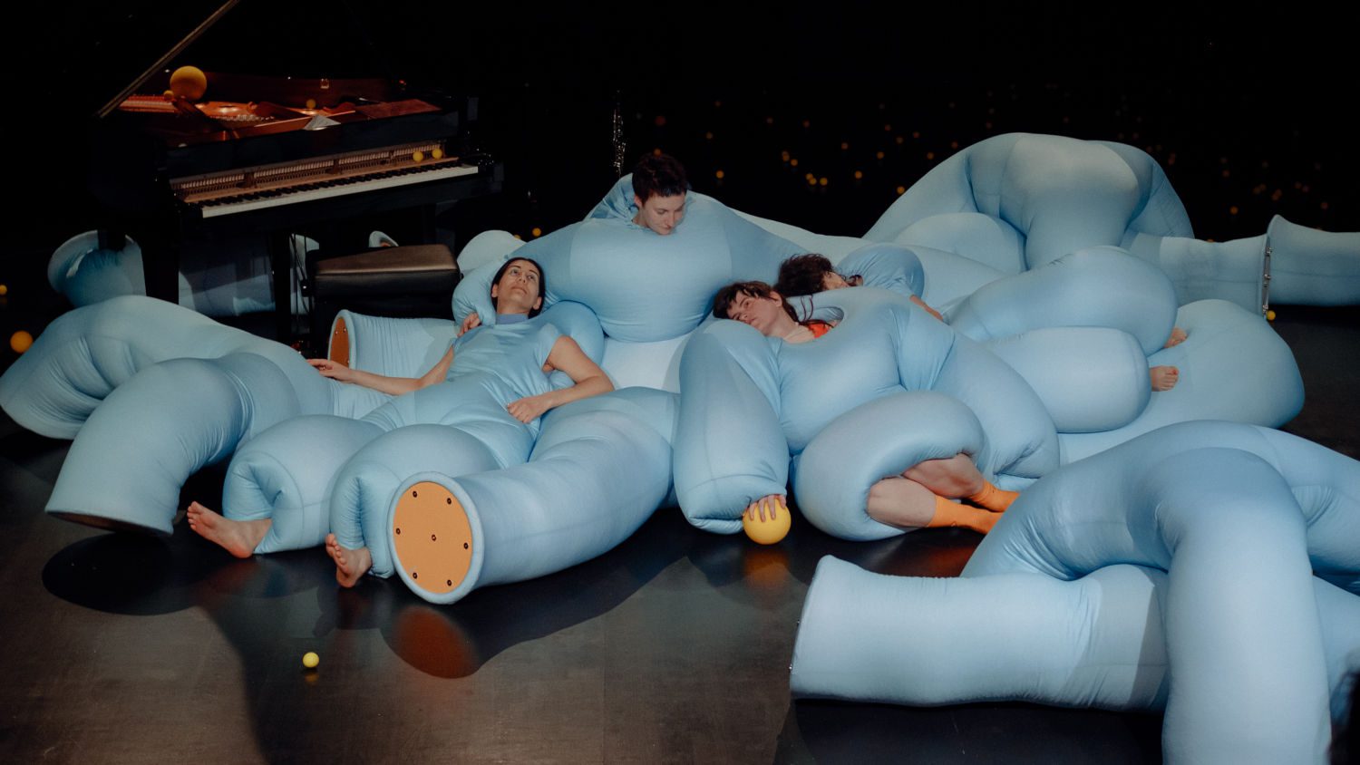 Zum Eintritt ein Lächeln. Lisa Heinrici, Schauspielerin, knautscht sich bäuchlings in einen Haufen überdimensionaler, molekülblauer Polster. Die Nervenzellen voller Styroporkügelchen sind Kuschelobjekte, bewegliche Bühnenbildteile (Hanna Naske, Marie Gimpel) und Kostüme (Filo Krause) zugleich. Lisa Heinrici lächelt, als sei sie gerade frisch durchgekuschelt, als wäre ihr Oxytocinspiegel bis zur Oberkante aufgefüllt.