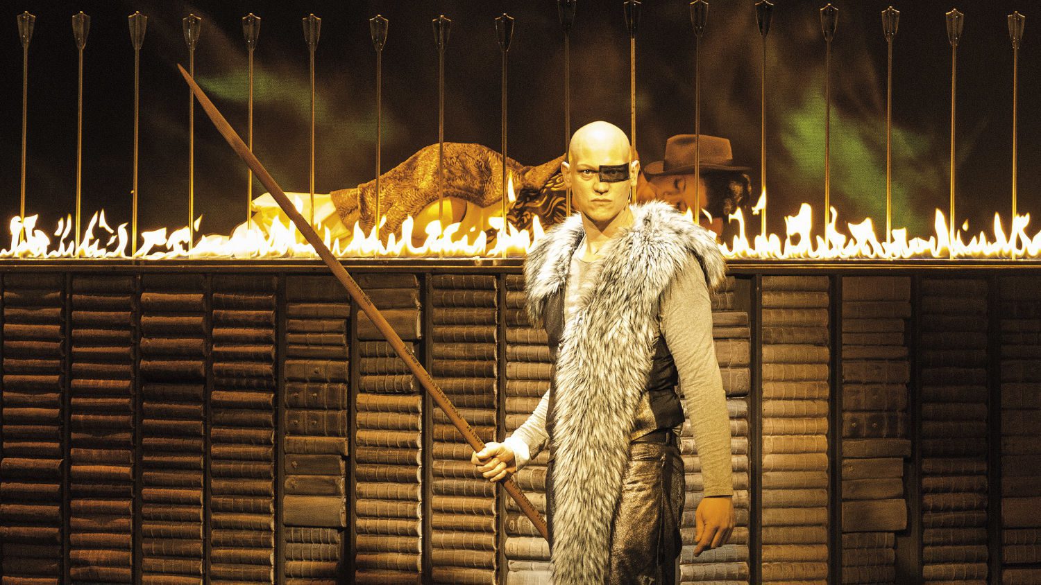 Das „Rheingold“-Bühnenbild einer Bibliothek als Walhall wird fortgeführt und bildet in diversen Anordnungen die Basis für die Inszenierung. Siegmund und Sieglinde finden in einem sich zum emotionalen Rausch steigernden ersten Aufzug zueinander. Wotan wird bei der Schwertgewinnung (zwei Stahlkrallen) übermächtig hinter Siegmund sichtbar – eindrucksvoll! Fricka ist eine poppige, fesche junge Frau, die genau weiß, was sie will, und ihrem ebenfalls jungen Mann den Eid schneidig abgewinnt. Ihr extravagantes Kostüm ist ebenso apart wie die der Walküren in Weiß mit schwarzer, mystischer Ornamentik attraktiv und jenes von Wotan mit Wolfsfell stimmig. Gar nicht in die Ästhetik dieser Bilder passen die Handys der Walküren und die damit im zweiten Aufzug per WhatsApp projizierten derb-politischen Sprüche gegen die Energiepolitik in Niederbayern. Dann dürfte Hunding nicht mit einem vorsintflutlichen Hammer herumlaufen …