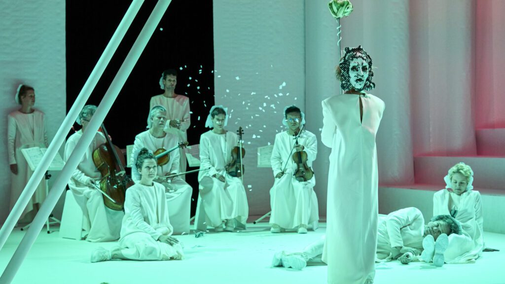 Inspirieren ließ sich Maike Graf von Homers Epos »Odyssee«, in dem Penelope zwanzig Jahre lang treu auf die Heimkehr ihres Gatten Odysseus nach Ithaka wartet und all die Freier, die ihr Haus umlagern, abweist. »Zu warten heißt zu lieben«, lautet ein zentraler Satz des Librettos. Und »keusch« ist denn auch das erste Wort, das Natasha López als Penelope, schwer atmend, stockend und immer wieder neu ansetzend, formt. Sie lotet in ihrer Darstellung das gesamte Spektrum stimmlicher Ausdrucksmöglichkeiten aus. Vom gehauchten Flüstern bis zum schrillen Schreien und vom rhythmischen Sprechen bis zum Gesang. Nicht nur das Zeitempfinden ändert sich im Warten, auch der Blick auf die Wirklichkeit verschwimmt. Das Warten schafft seine eigene Welt. Penelope webt ihren Wartesaal. Vorfreude hat im ungewissen Warten keinen Raum.
