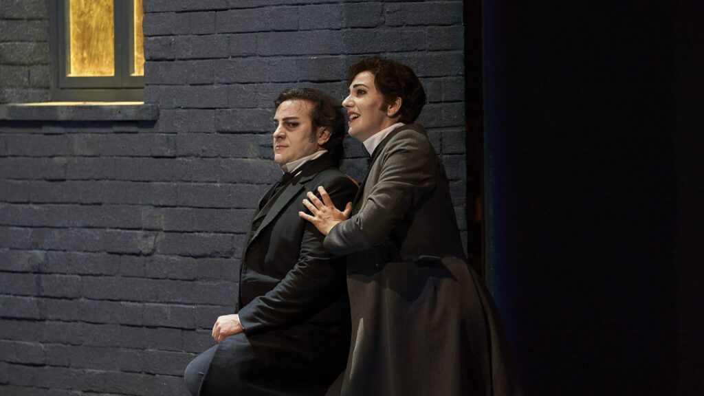 In der morbiden „toten Stadt“ Brügge kommt Paul nicht über den Tod seiner Ehefrau Marie hinweg. Er hat sich in einer „Kirche des Gewesenen“ eingerichtet, ihr Bild und eine Haarsträhne zum Altar erhoben. Wolf Gutjahr übersetzt das düster Gruftige dieser Atmosphäre auf der Drehbühne in ein schmuckloses Labyrinth aus schwarzen Stellwänden. Diverse Leuchtröhrenumrahmungen deuten in ihrem exzessiven Farbwechsel auf das Changieren zwischen Traum und Wirklichkeit. Da Pauls Zufallsbekanntschaft Marietta seiner Marie verblüffend ähnelt, lädt er das Temperamentsbündel in Weiß zu sich ein. Aber er sieht in ihr nicht die lebenslustige Künstlerin und Frau, sondern eine Reinkarnation der Verstorbenen. Der Regisseur Jochen Biganzoli lässt die tote Marie und die lebende Marietta direkt aufeinandertreffen, was zu einem handfesten Kampf eskaliert. Lena Kutzner verkörpert die temperamentvolle Marietta, und der erstklassige Charles Workman steht als ihr Paul auf der Bühne.