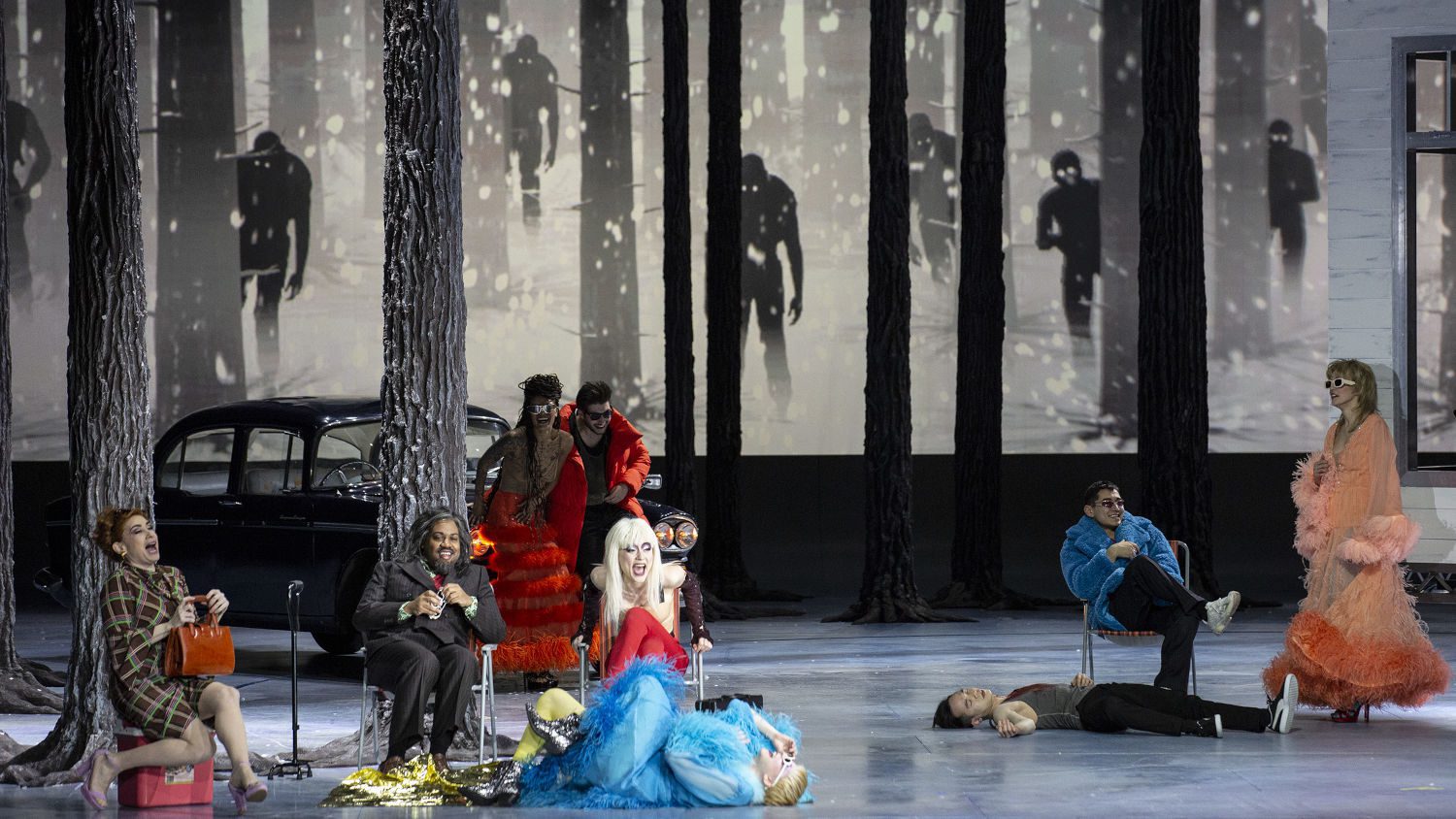 Es kommt, wie es auch der Mythologie nach zu kommen hat: blutiger Suizid der Dido – in München inmitten eines winterlichen, abgestorbenen Forsts. Viel Schneetreiben und kahle Nadelbäume, dazu einen gläsernen Speisesaal, der sich wie Dido und Aeneas entzweien wird, hat Ausstatterin Małgorzata Szczęśniak für die desillusionierende Handlung aufbieten lassen.