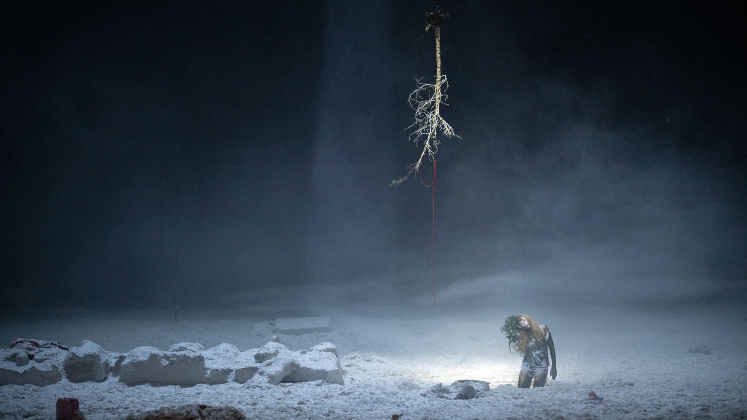 Im Tempe-Tal rieselt der Schnee, erst leichter, dann immer stärker, bis er auch den Orchestergraben erreicht. Zuerst erinnert das noch an alte Bilder göttlicher Inspiration: Erleuchtete Flocken fliegen den Menschen zu. Später eher an einen Schneesturm. Es ist eine noch recht poetische Welt, in die man so entführt wird, in welcher der Gott immerhin ein Gott sein könnte. Die Rollengestaltung von Pavel Černoch als Apollo – ernst, getragen, mit tiefem Ansatz und großen Gesangsflügeln – gibt dazu einigen Anlass, ebenso seine ritualisierte Gestik wie aus dem Ägypten-Comic. Bei Anna Kissjudits Gaea wirkt das Tief-Getragene anfangs etwas aufgesetzt, kommt nicht recht vom Fleck.