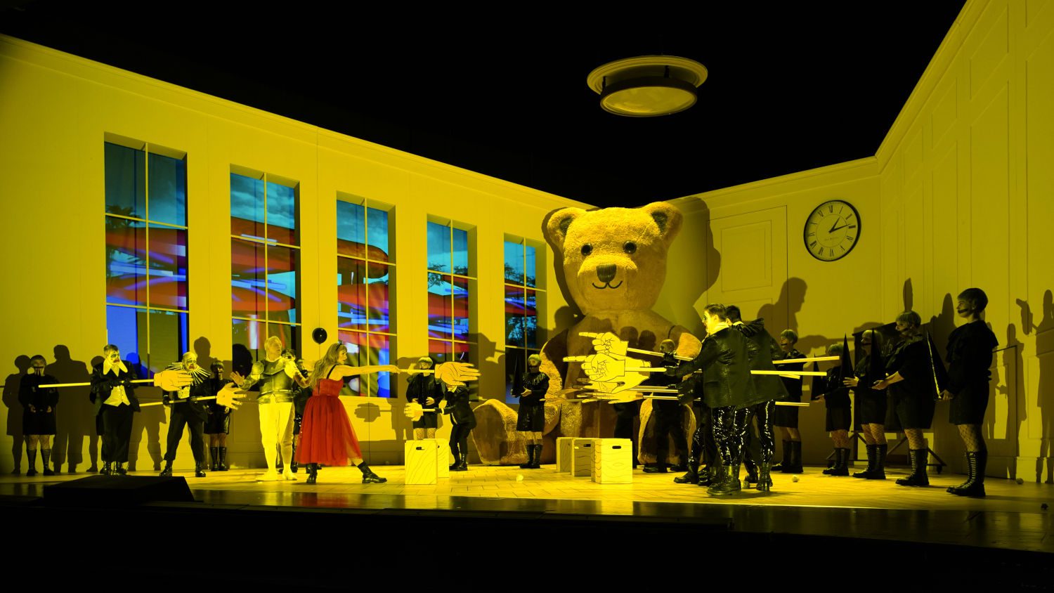 Es beginnt in Evas Kinderzimmer mit einem Riesen-Teddybär und aufziehbaren Spielzeugfiguren à la Olympia. Diese vertändeln freilich das ganze Vorspiel, bevor Eva ihren „Helden“ mit anonymer weißer Maske aus einer Spielzeugkiste holt und ihn auf der Festwiese nach dem Preislied wieder in einen solchen verpuppt, um dann mit den Worten „Nicht Meister! – Nein! Will ohne Meister selig sein!“ zu verschwinden. Man will also die Frage stellen, ob die Frau nach heutigen Maßstäben noch so auf der Opernbühne gezeigt werden kann, wie Eva in der Oper von Wagner konzipiert wurde.
