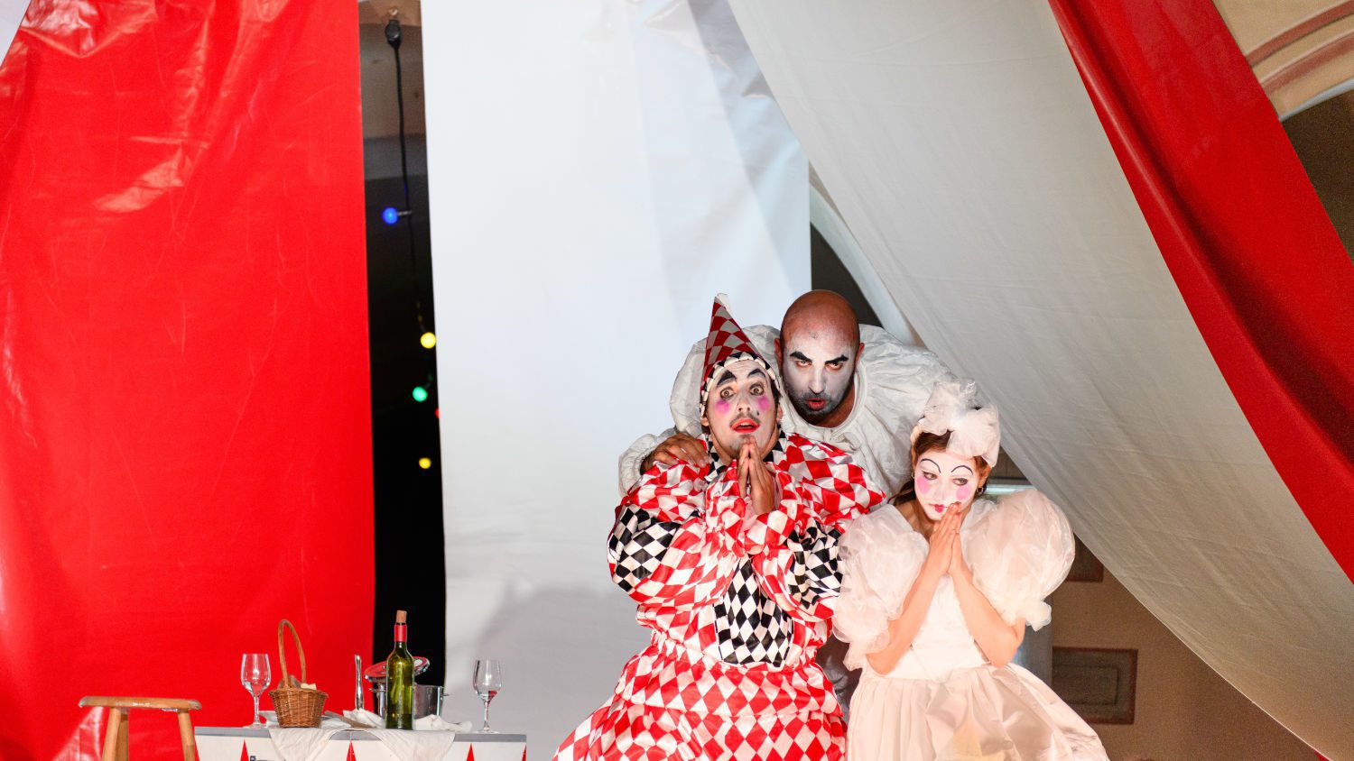 Mit weitaus weniger Originalität – wenngleich das Bügeleisen, das Nedda zur Abwehr einsetzt oder das unbeugsame Gummihuhn im Komödien-Kochtopf des zweiten Akts für Lacher im Publikum sorgen –, konventionell und meist im „Frontalmodus“ der Agierenden setzt Regisseur Andreas Merz Raykov das szenische Geschehen auf der von Mariia Krutoholova (Bühnenbild) und Joachim Steiner (Kostüme) ausgestatteten Bühne um. Im zeitlichen Irgendwo verortet, vertraut er – sicher nicht ganz zu Unrecht – stark auf die emotionale, die Figuren charakterisierende und das Geschehen tragende Kraft des Librettos und die vielen intensiven ariosen Momente im intriganten Spiel des verschmähten, seelisch so verletzten Tonio.