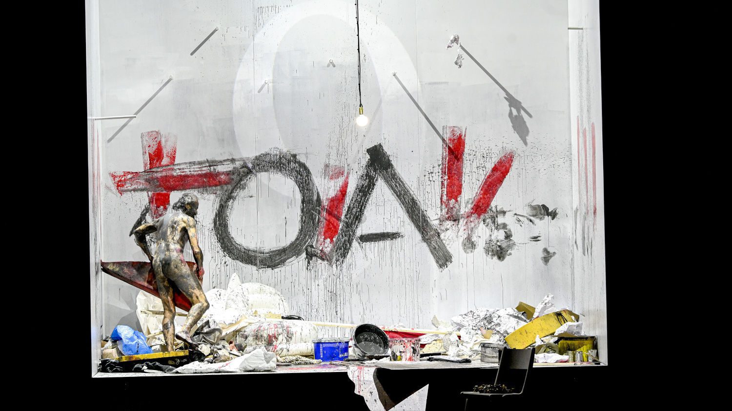 Der Kern aber ist der Verzicht auf den szenischen Bilderzauber, der meist beim Tanz um das Goldene Kalb entfesselt wird. Hier sind es nicht die von Moses allein Gelassenen, die außer Rand und Band geraten – hier ist es Moses, der allein auf sich gestellt mit sich und seinem Gott ringt. Äußerlich sieht das nach einer Melange aus Zerstörungswut und kreativem Schub eines Künstlers aus. Der Sänger Dietrich Henschel geht in dieser Sprechrolle ins körperliche Extrem. Bis die Zehn Gebote beisammen sind, fallen in einer einsamen Kammer immer wieder Gegenstände auf ihn herab. Er zerstört sie, verletzt sich, legt alle Sachen ab, beschmiert sich mit Farbe und malt mit seinem ganzen Körper die Wände voll. Damit wird der Tanz um das Goldene Kalb quasi auf die andere Seite des Konfliktes zwischen den beiden Brüdern gespiegelt. Der lebendige Körper von Moses „ersetzt“ die Gesetzestafeln aus Stein.