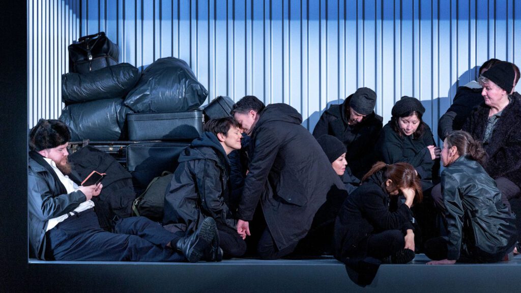 Die Inszenierung von Cyril Teste zeigt die Druiden gekleidet wie Soldaten der Résistance, die sich als Gefangene ihrer Stadt verteidigen müssen; angesiedelt in einer Fabrikhalle, die auch als Lazarett dient. Umbauten gelingen ohne störende Pausen, wenn wenige Mauerteile einen Tempel stimmig darstellen oder das Esszimmer von Norma gezeigt wird. Allgegenwärtig ist der Wald als Projektion, wo mit Farben verschiedene Stimmungen erzeugt werden. Die Figuren sind offensichtlich Waldmenschen mit einem Fetisch für farbenreiche Tücher, die in religiös-rituelle Choreografien – etwas linkisch – eingebaut werden. Leider fehlt jegliche Personenführung, meist wird statisch gestanden und die Beziehungen zwischen den Protagonisten kommen darstellerisch nicht zum Ausdruck. Da hilft auch kein Live-Video mit berührenden Projektionen der Gesichter auf dem durchsichtigen Vorhang.