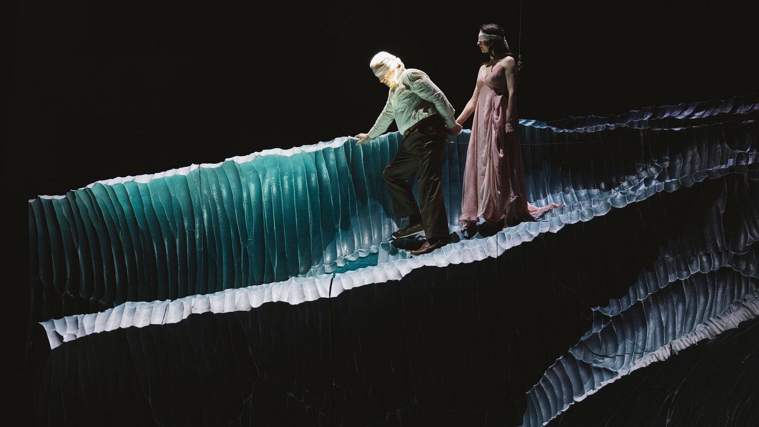Als Spielort dient der trostlose Gemeinschaftsraum eines Altenheims, nebenan befindet sich eine Leichenhalle samt Kühlzellen. Der Coup der Inszenierung ist, dass der zentrale Handlungsort der erzählten Vergangenheit, ein Strand, als lebensgroßes Diorama nachgebaut wurde und per Drehung der Bühne zum Vorschein kommt. Eine gewaltige Meereswelle ist zur Skulptur erstarrt, davor sind jugendliche Doppelgänger der vergreisten Protagonisten zu sehen, zunächst in eingefrorenen Bewegungen, später auch in einfühlsamen Choreografien, welche die Vorgeschichte lebendig werden lassen. Zwei Tänzer (Bianca Zueneli als junge Léïla und Jan Deboom als junger Nadir) werden zu gleichberechtigten Darstellern. Eugene Richards III, der sich als junger Zurga bruchlos in die Choreografie einfügt, offenbart im letzten Akt zudem noch einen sonoren Bassbariton, weil das Regieteam ihn mit der Rolle des Gemeindeältesten Nurabad gleichsetzt, wodurch der alte Zurga nun mit seinem jüngeren Ich konfrontiert wird.