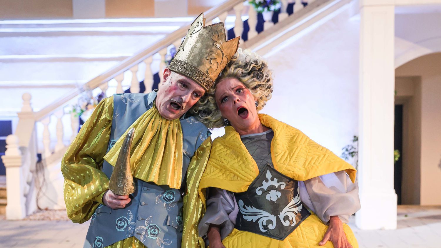 Mit ironisch historischen Kostümen (Anna-Sophie Lienbacher) und treffend überzeichneter Maske (Zarah Bugnar) wird das dekadente Fürstentum in Szene gesetzt. Bühnenbildner Roland Tscherne lässt das reizende Schloss Hainburg für sich wirken, ergänzt um einen Multifunktions-Kammerspielraum, der Schlafzimmer und gleichzeitig Thron ist.