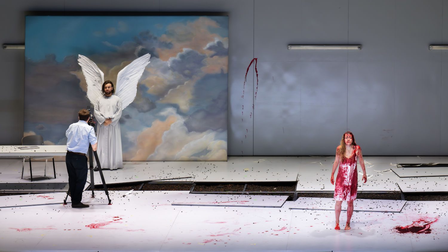 Kratzer setzt in der Suche nach der Erlösung auf starke Bilder: beginnend mit einer Peri, die mit verbliebenen Federn versucht, wieder zu fliegen, über einen Chor, der endlos hektisch von beiden Seiten über die Bühne läuft und Peri den Anschluss verwehrt, bis zu Kindern, die unter einer Glaskuppel mit Autos und Flugzeugen spielen, während Schornsteine alles vernebeln und sie umkommen lassen. Absperrbänder und Quarantäne-Zelte zu „stirbt jetzt, als hätte er keinen Freund“ offenbaren Kratzers akribische Liebe zum Libretto wie auch der Abschlusschor „Sei uns willkommen, sei uns gegrüßt!“, der sich vor allem ans Publikum richtet.