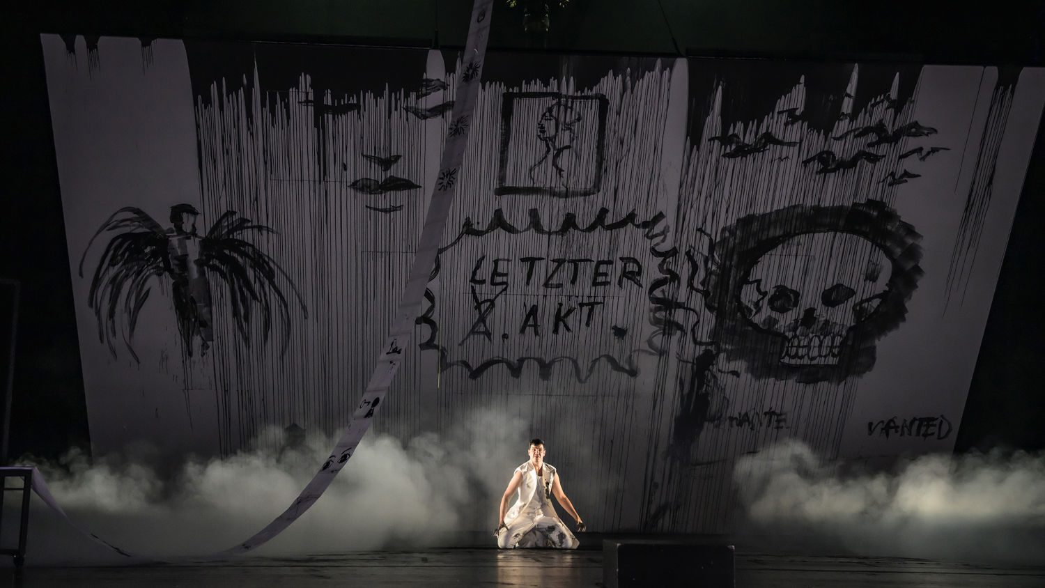 „Are you Donna Elvira? Are you Don Giovanni?“ Mitten in der laufenden Inszenierung von Mozarts Oper erscheinen diese Fragen wie von Zauberhand geschrieben auf dem riesigen weißen Bühnenprospekt. Die Zauberhand gehört der Live-Zeichnerin Anni von Bergen. Vom Bühnenrand aus entwirft sie mit Pinsel und schwarzer Farbe synchron zum Bühnengeschehen Figuren, Symbole, Linien oder auch schon mal bei besonders leidenschaftlichen Szenen wütend hingeworfene Kleckse und Spritzer. Eine Kamera projiziert alles direkt auf den Prospekt. So entsteht ein sich ständig änderndes Bühnenbild, das die Handlung kommentiert, karikiert oder auch fokussiert. Die Riesenfläche ist durchbrochen von Türen, Toren oder kleinen Balkons und Fenstern in der Höhe. Das sind Öffnungen für Abgänge und überraschende Auftritte, für heimliches Beobachten oder Liebesgeplänkel in luftiger Höhe.
