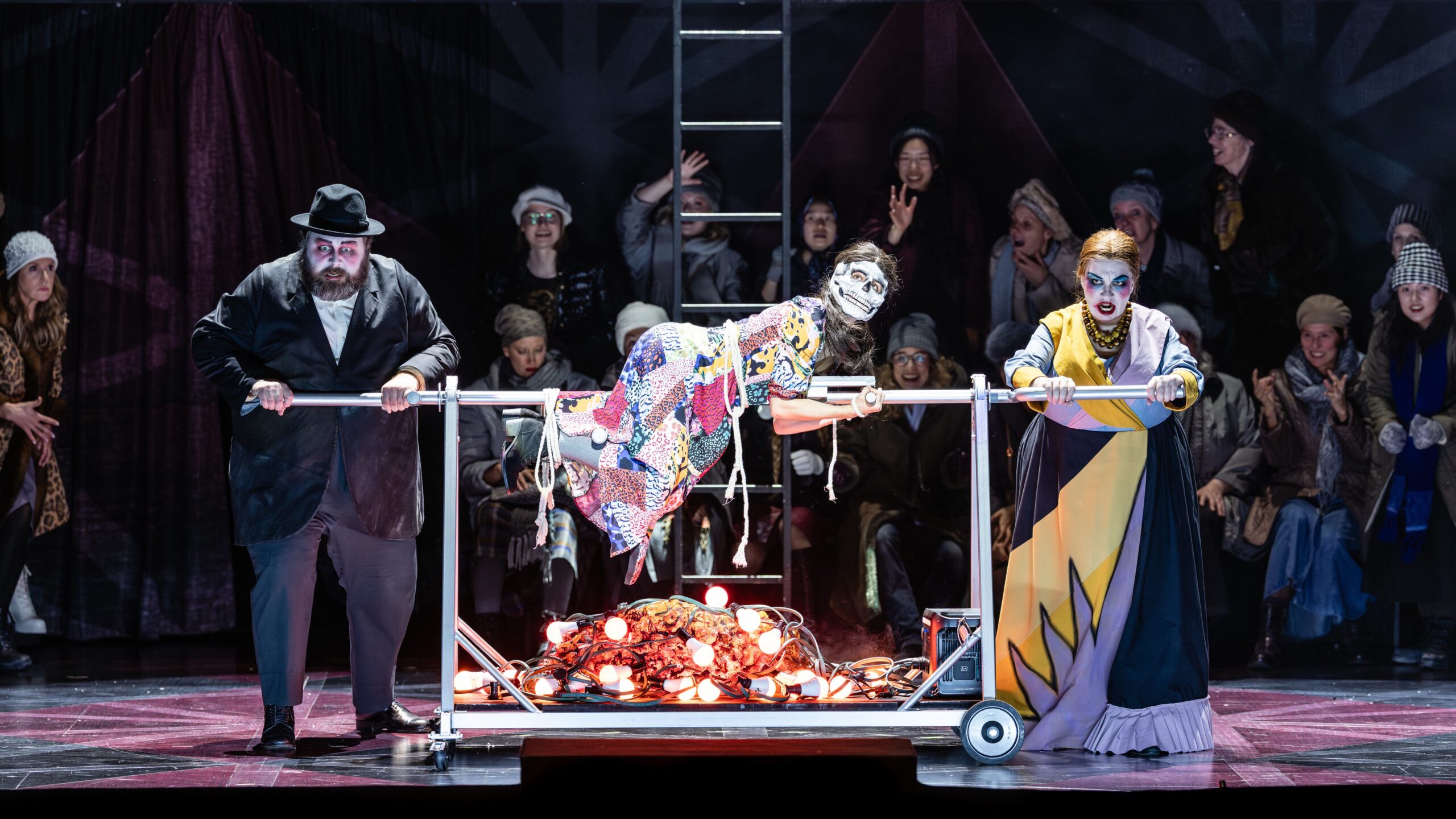 Wenn sich nun final Wakula und Oksana ganz in Weiß in die Arme fallen, dann blitzt nach einem bunten Abend der Gedanke nicht nur an Scherz, Satire, Ironie auf, sondern auch an Persiflage. Barrie Kosky ist als Regisseur einmal mehr an der Staatsoper zugange, diesmal routiniert das abspulend, was mutmaßlich beim Publikumsdurchschnitt Effekt macht, insbesondere bei einer Art „Familienabend“: Komik, Clownerie, auch Klamauk. Sein Rahmen für die Inszenierung: Ein Dorfvölkchen bringt – unter der Spielleitung eines boshaften Springteufels – sich selbst auf die Bühne. Erprobt wirbelig das Ganze, und auch ein zwölfköpfiges Teufelsballett sowie ein schwer feminin wirkendes Diversitätsballett sind – ausufernd – mit von der Partie. Mal wird Can Can getanzt, mal Kasatschok. Na ja. Im abstrahierenden Schneeflocken-Bühnenbild von Klaus Grünberg ist Hauptprotagonistin gleichsam Frau Holle. Viele, viele Papierschnipsel und einige Gänsefedern schaffen winterlich-weiße Gefühle.