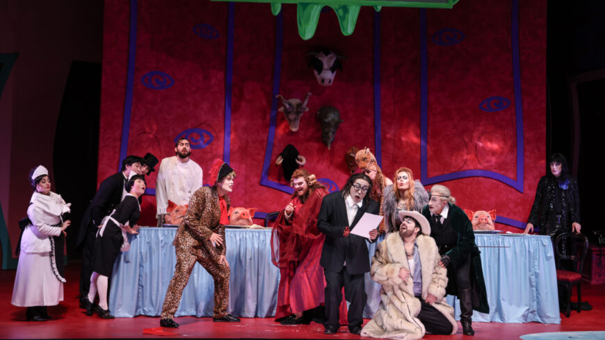Das Bühnenbild von Stella Lennert zeigt einen immer bedrohlicher wirkenden Hotelflur mit verzogenen Türen und auch die Kostüme von Hanna Rode sind in ihrer phantasievollen und skurrilen Überzeichnung von starker, prägender Wirkung. Der Orchestergraben ist hier ein Swimmingpool, in den die Modistin (Yoona Jang) schon mal hineingeschubst wird. Und es passiert auch sonst so einiges in diesem Hotel. Dabei wird geschickt immer wieder um zehn Jahre zurückgeblendet. Da wird ein Leopard vom Koch (Jasin Rammal-Rykała) abgemurkst und zu einer Kopfbedeckung verarbeitet, eine riesige Hand krabbelt durch den Hotelflur und ein menschengroßer, zappelnder Hummer wird auf dem Tisch bearbeitet. Es gibt ein Duell mit Degen und die Pferde demonstrieren mit Plakaten. Und auch eine lesbische Beziehung zwischen Corinna und der Marchesa Melibea (sehr präsent: Nathalie Mittelbach) wird offenbar.Im Original feiern alle am Ende und singen Nationalhymnen. Die sind hier gestrichen und durch Musik aus Rossinis „Stabat Mater“ ersetzt, bei der Corinna ihrerseits die gesamte Gesellschaft vergiftet. Das ist ein unerwarteter und jäher Stimmungsumschwung von nachhaltiger Wirkung.