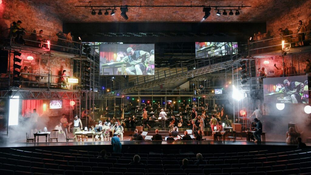 Die Zuschauer sind auf der Bühne platziert, das Orchester im Graben. Gespielt wird bei Regisseur Immo Karaman auf einem Laufsteg aus unzähligen ausrangierten Schuhen (!). Der Strom der Zeit von Urzeiten an wird hier zu einem Strom von Menschen, die immer nur (auch im Wortsinn) beladen und auf der Flucht sind. Mit dieser in ihrer assoziativen Überstrapaziertheit mehr als heiklen Metaphorik kontrastieren die – nur für sich genommen opulent wogenden – dekorativen Videoüberblendungen der Ränge des Zuschauersaales.
