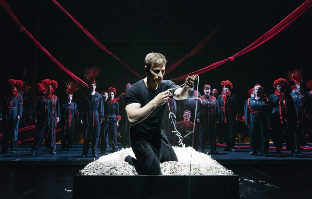 Szenisch stehen zunächst die Orchestermusiker auf der Hauptbühne im Mittelpunkt der Aufführung. Der Zuschauerraum hinter ihnen bleibt leer. Die Besucherplätze wurden auf der Hinterbühne errichtet. Zwischen Orchester und Publikum sitzt Georg Festl und knüpft ohne Unterlass Fäden zusammen, schon Minuten bevor die Musik mit einem Orgelpunkt auf dem tiefen C einsetzt. Dazu erhebt er dann mit kernigem Bassbariton und klarer Diktion die Stimme, um vom Zerrinnen seines Lebens und der Sehnsucht nach Freiheit zu singen. Von Ferne antwortet mit hellem Sopran Jana Baumeister als die Stimme seiner Seele, dann auch ein Chor, der den Übergang in die Unsterblichkeit verheißt. Das ist in der szenischen Konzentration und der Nutzung des Raumklanges ein starker Beginn, nicht zuletzt wegen der enormen Bühnenpräsenz von Georg Festl. Die Musik entfaltet auf diese Weise schnell eine große Sogkraft.