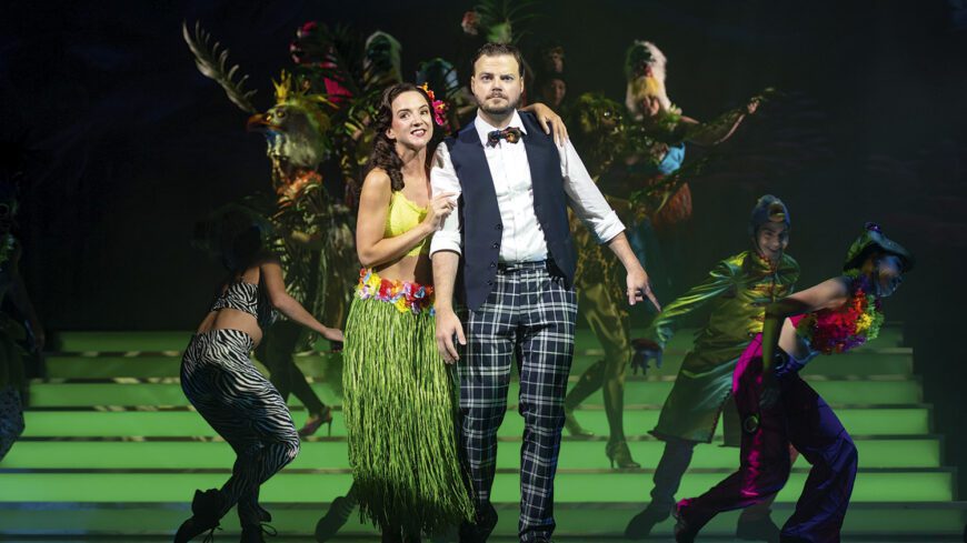 Die jazzige Revue-Operette „Die Blume von Hawaii“ von Paul Abraham erzielte bei der Uraufführung 1931 einen grandiosen Erfolg. In der Mischung aus Südseeromantik, Polit-Komödie, Erotik-Revue und Liebessehnsucht war sie zum amüsanten Spektakel avanciert, das dem damaligen Musiktheater-Zeitgeschmack die passende Nahrung gab. Hawaii-Gitarren und chinesische Trommeln, Jazzsänger und Stepptänzer, eine Marinemannschaft, Revuegirls und verführerische Insulanerinnen gehören auch heute noch zu den Erfolgszutaten. So tummelte sich auf der Bühne des Salzburger Landestheaters das muntere Theatervölkchen voll sprühender Lebensenergie und unbändiger Lust am Spielen, Tanzen und Singen. Mit frischen Stimmen, schäumender Spiellaune und wirbelndem Tanztemperament zeigten alle Darsteller mitreißende Präsenz im hoch motivierten Miteinander. Kostüme, Bühnenausstattung und schillernde Lichteffekte ergaben eine farbenfrohe Optik (Bettina Richter und Christian Floeren).