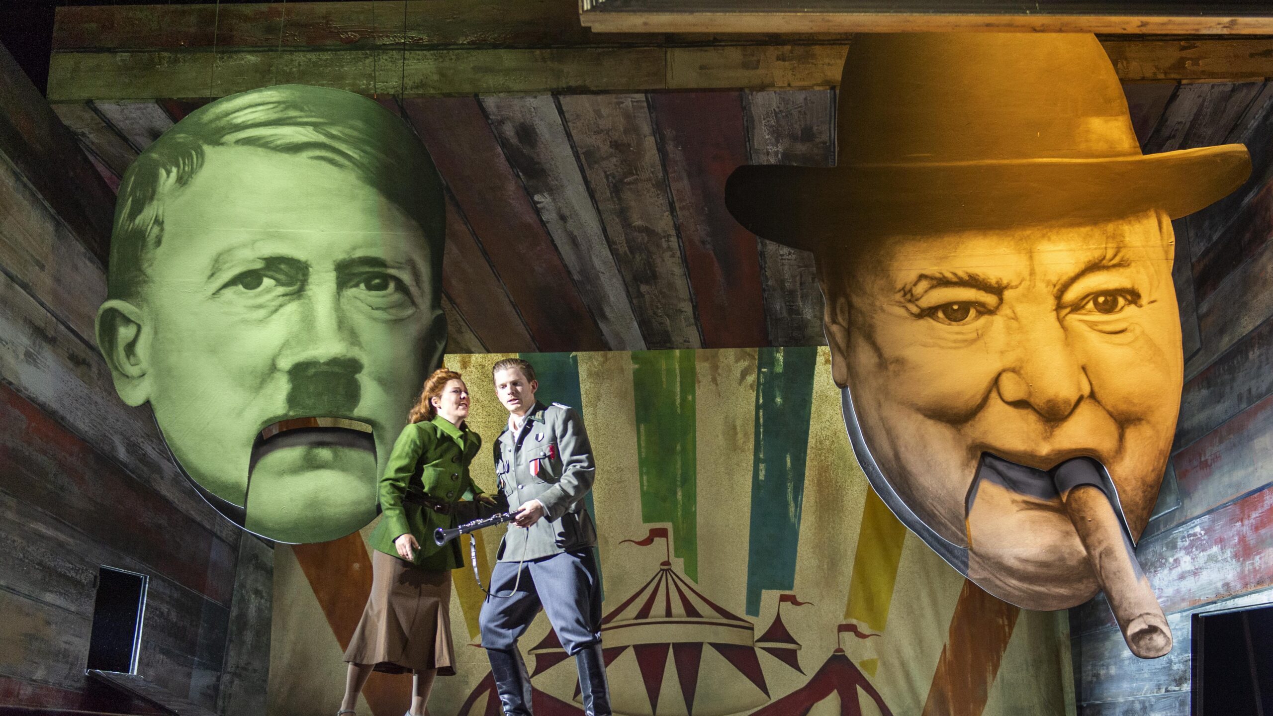 Dieser Vielschichtigkeit wird Jürgen R. Weber in seiner Bonner Inszenierung in hohem Maße gerecht. Er lässt die Handlung realistisch in einem historisierten Ambiente – phantasievoll entworfen von Hank Irwin Kittel – ablaufen und stellt ihr als Kontrast eine Zirkuswelt gegenüber, bestehend aus einem Panoptikum von schrägen Artisten. Wie er das Kriegsgrauen mit schwarzem Humor verknüpft, ohne es zu bagatellisieren, ist meisterlich: Die französische Nationalfigur „Marianne“ kämpft gegen Soldaten mit Beethoven-Masken und Hakenkreuz-Armbinden, ein Verweis auf die Vereinnahmung des Komponisten durch die Nationalsozialisten; die Antipoden Hitler und Churchill erscheinen als übergroße Schießbudenfiguren; ein Totenkopf mit Clownsnase guckt in den Zuschauerraum. Beherrschend aber ist ein vom Schnürboden hängender riesiger Gemälderahmen, auf dessen Leinwand knallbunte Trickfilme projiziert werden. Der erste heißt „Circus Hitler – Welttournee“, der letzte mit der Jahreszahl 1945 „Circus Hitler ist unbekannt verzogen“. Eingeblendet wird auch mitunter das Orchester, das wie der Chor unsichtbar hinter der Bühne platziert ist. Der Klang leidet nicht darunter, denn Dirigent Daniel Johannes Mayr sorgt für kristalline Durchsicht und klare Strukturen. Barbara Senator singt mit lichtem, klarem Sopran eine ganz fabelhafte Yvette. Einen sympathischen Albert verkörpert der junge Santiago Sánchez, nur erklimmt der Tenor die Höhe noch nicht ganz mühelos. Rollendeckend ist die ältere Generation mit Susanne Blattert und Pavel Kudinov besetzt. Eine tolle Figur macht Joachim Goltz: Als schwarzgewandeter Engel verbindet er vokale Prägnanz mit Entertainer-Qualitäten.