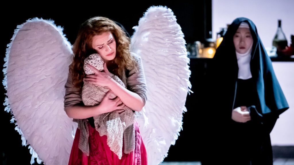 Die „artigen“ Kinder der Amtmann-Familie proben und singen mit dem Vater (Daniel Ochoa) und den älteren Schwestern Sophie und Charlotte im Sommer ein Weihnachtsspiel – ein skurriles Familienidyll. Reizend der Einsatz der Kinder: Spielend, lachend und singend erfüllen sie die Szenen mit erfrischender Heiterkeit. So auch Charlottes Schwester Sophie (Eva Zalenga), die nicht nur stimmlich umwerfend ist, sondern ihre Rolle in allen Facetten mit Herzenswärme füllt. Seymur Karimov als Albert singt kraftvoll und vermittelt als blasser Bürokrat Solidität – was ihm in seiner Rolle an Leidenschaft fehlt, das sollte Werther im Übermaß haben. Amar Muchhala als Werther kann stimmlich in seidenmattem Tenorglanz voll überzeugen, legt auch reichlich Gefühl in seinen Gesang, „stolpert“ aber im körperlichen Ausdruck etwas ungelenk durch seine Gefühlswallungen. Vera Semieniuk als Charlotte setzt mit stimmlicher Ausdruckskraft die bis ins kleinste Detail ausgearbeiteten Linien mit Aufrichtigkeit und Finesse um: „Um nicht mich zu verlieren, habe ich dich verloren.“ Man glaubt es ihr wirklich.