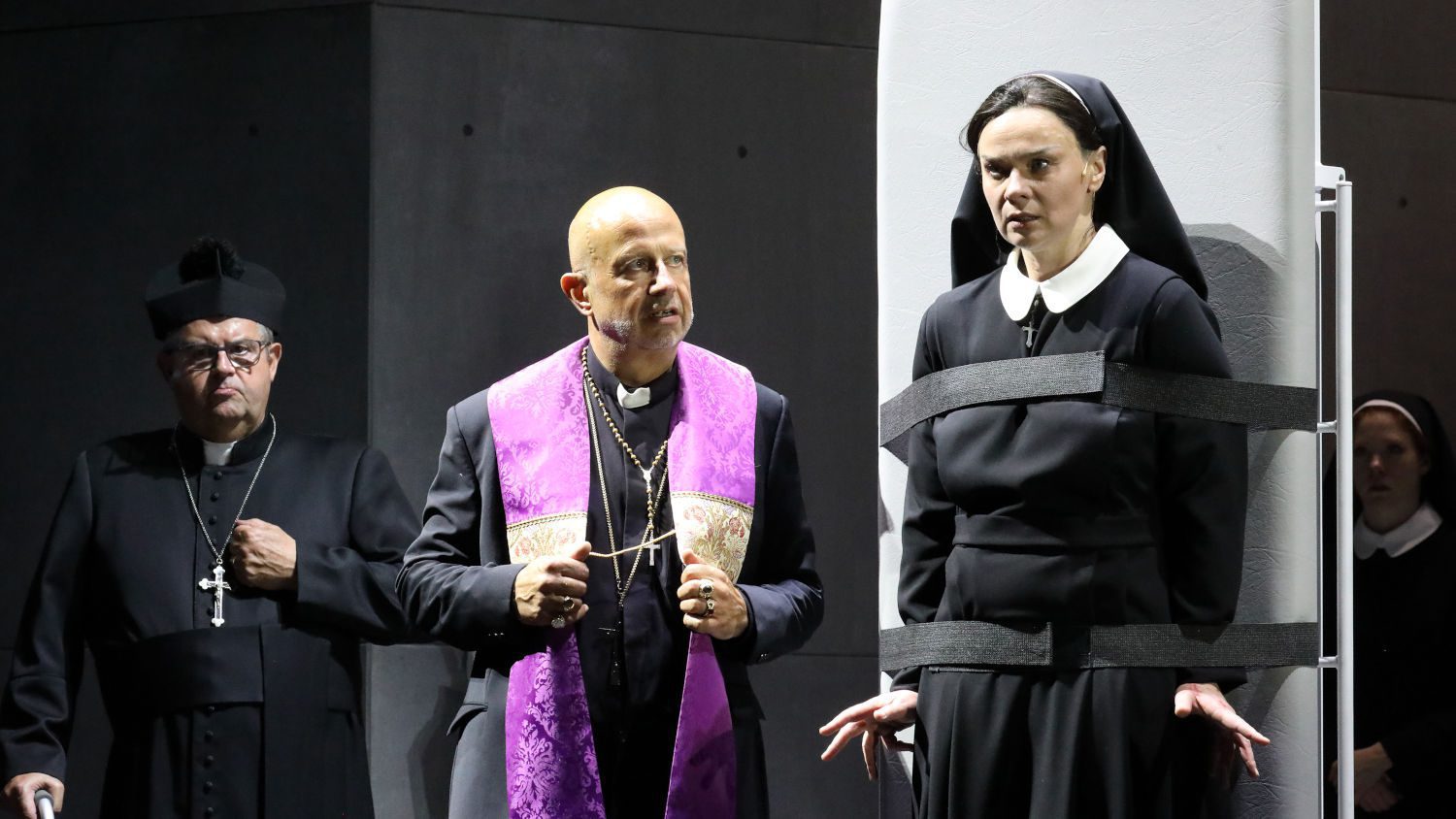 Was den musikalischen Gesamteindruck abrundet, ist ein mustergültig besetztes (und exzellent textverständliches) Solisten-Ensemble. Allen voran Aušrine Stundyte, die mit hochexpressiver Gesangs- und Schauspielkunst die unerfüllten Begierden der Jeanne in kühl-schizophrenem Wahnsinn auslotet. Martin Winkler entlarvt den Exorzisten-Pater Barré mit voluminösem Bassbariton als animalische Bestie unter einer Fratze der Scheinheiligkeit. Wegen Wolfgang Kochs Covid-Erkrankung musste für die Partie des Grandier in kürzester Zeit eine alternative Lösung gefunden werden: Jordan Shanahan (viriler, technisch hervorragender Bariton) und Robert Dölle (glaubwürdig in Schauspiel und Sprechpassagen) retten die Premiere, was den Priester zwischen Verführer und Märtyrer letztendlich mit einem interessanten Verfremdungseffekt sogar zusätzlich isoliert.