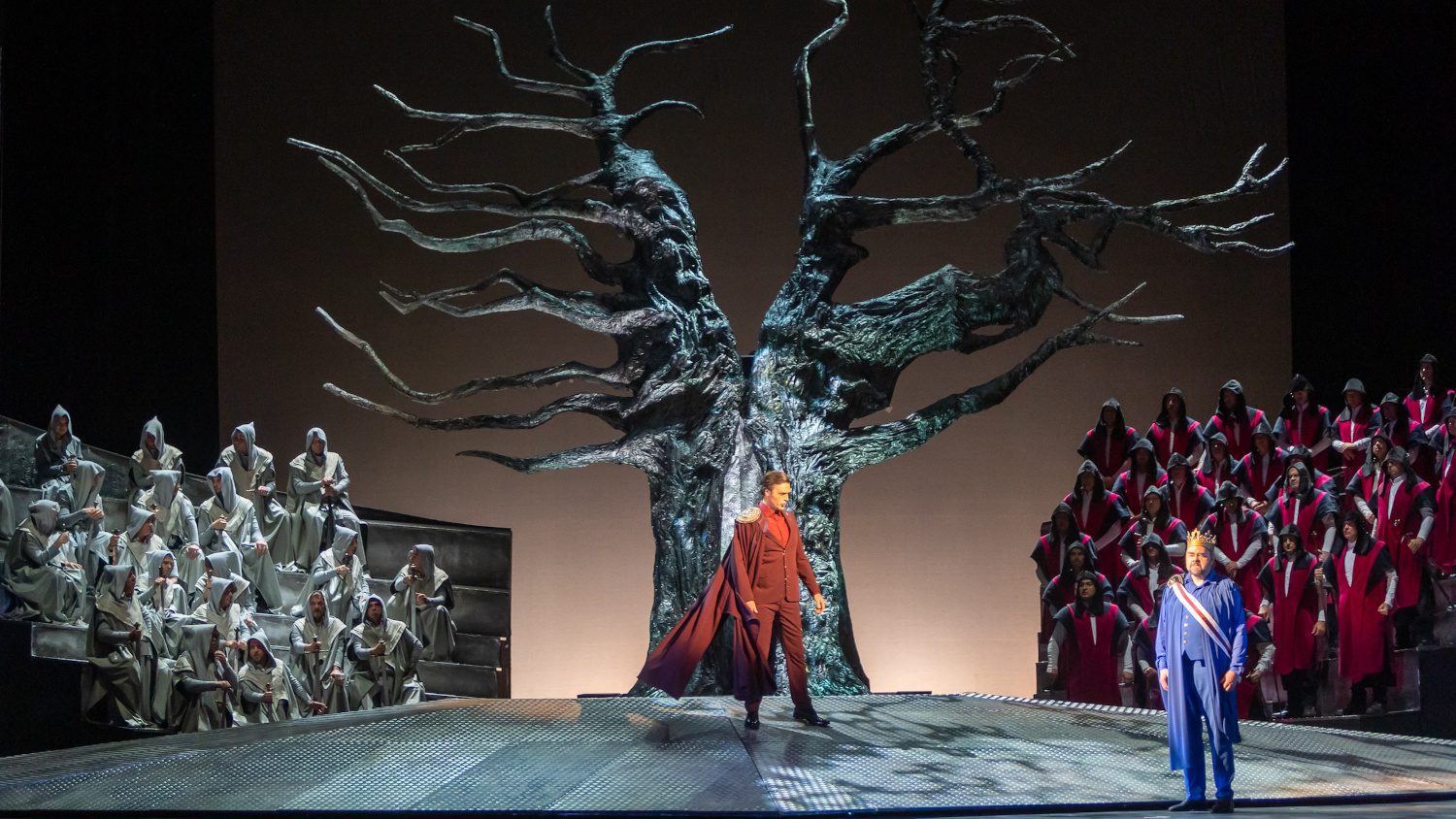 Sein „Lohengrin“ beginnt während der Ouvertüre mit dem Schlussbild des „Parsifal“ – und der Artusrunde, aus der Parsifal langsam heraustritt: Er hat den Ruf Elsas gehört! Ab diesem Zeitpunkt ist das gesamte Geschehen der großen Eiche auf der Bühne zugeordnet, ihre Farben und die Einbindung in die Handlung bilden den Subtext der Erzählung. Der Chor mit über 80 Sängern ist gewaltig – bisweilen etwas zu sehr und auch etwas statisch im Hinblick auf das sonst bewegte Bühnengeschehen. Mario Dices Kostüme sind vielfältig, allerdings fragt man sich manchmal, ob sie wirklich thematisch passen, wie etwa beim in Kutten gewandeten Herrenchor.