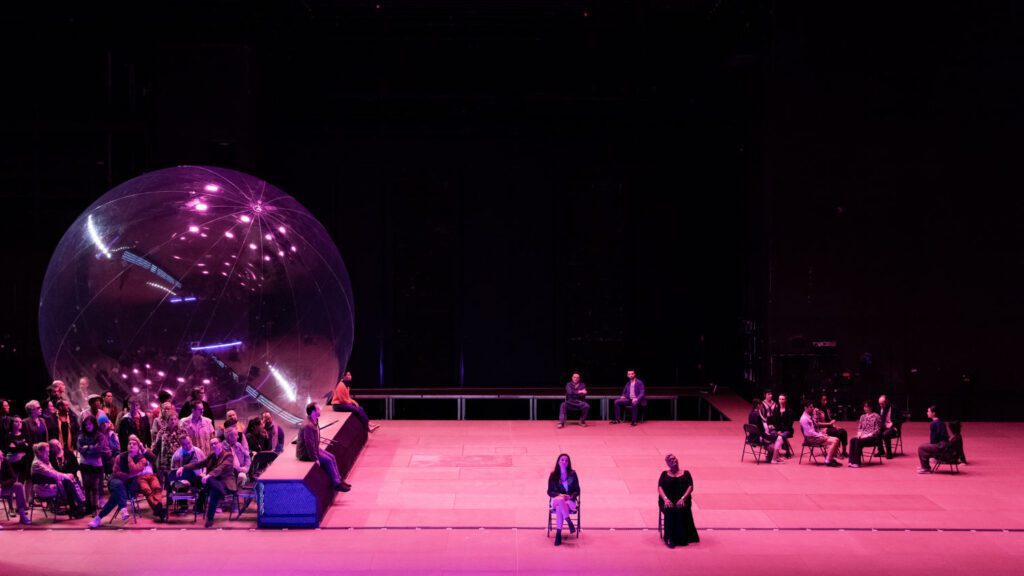 Dieser Riccardo ist kein König Gustav III. von Schweden; und dieser Riccardo ist kein Gouverneur von Boston – wie sie alternativ in den zwei Fassungen von Verdis Oper „Un ballo in maschera“ hinterrücks ermordet werden. Dieser Riccardo in Augsburgs Neuinszenierung ist ein Künstler, ein Theatermacher, der selbstverliebt seine Lebensgeschichte auf die Bühne zu bringen trachtet und sich gerne dafür die Schwingen von Pegasus anschnallt. Zur Seite steht ihm Oscar als Regieassistent – und so eilen beide immer wieder hin und her zwischen Augsburgs Interimsbühne im martini-Park und dem mitten im Zuschauerraum belassenen Regiepult. Leben und Tod sind Kunst, sind große Oper. Da inszeniert sich ein Dramatiker und Theater-Protagonist selbst und verklärend: als einen guten, etwas diversen Menschen, als ein Opfer, als einen Märtyrer. Mal etwas divenhaft, mal etwas tuntig, mal etwas larmoyant, mal etwas kindlich. Vom Erhabenen zum Lächerlichen ist es mitunter nur ein kleiner Schritt … Im Finale, wenn er eigentlich mausetot ist, unser großer Bühnenkünstler, dann schwillt ihm noch einmal die Brust, dann reckt er noch einmal den Arm in die Höh’ – um den Sieger in Pose zu geben.