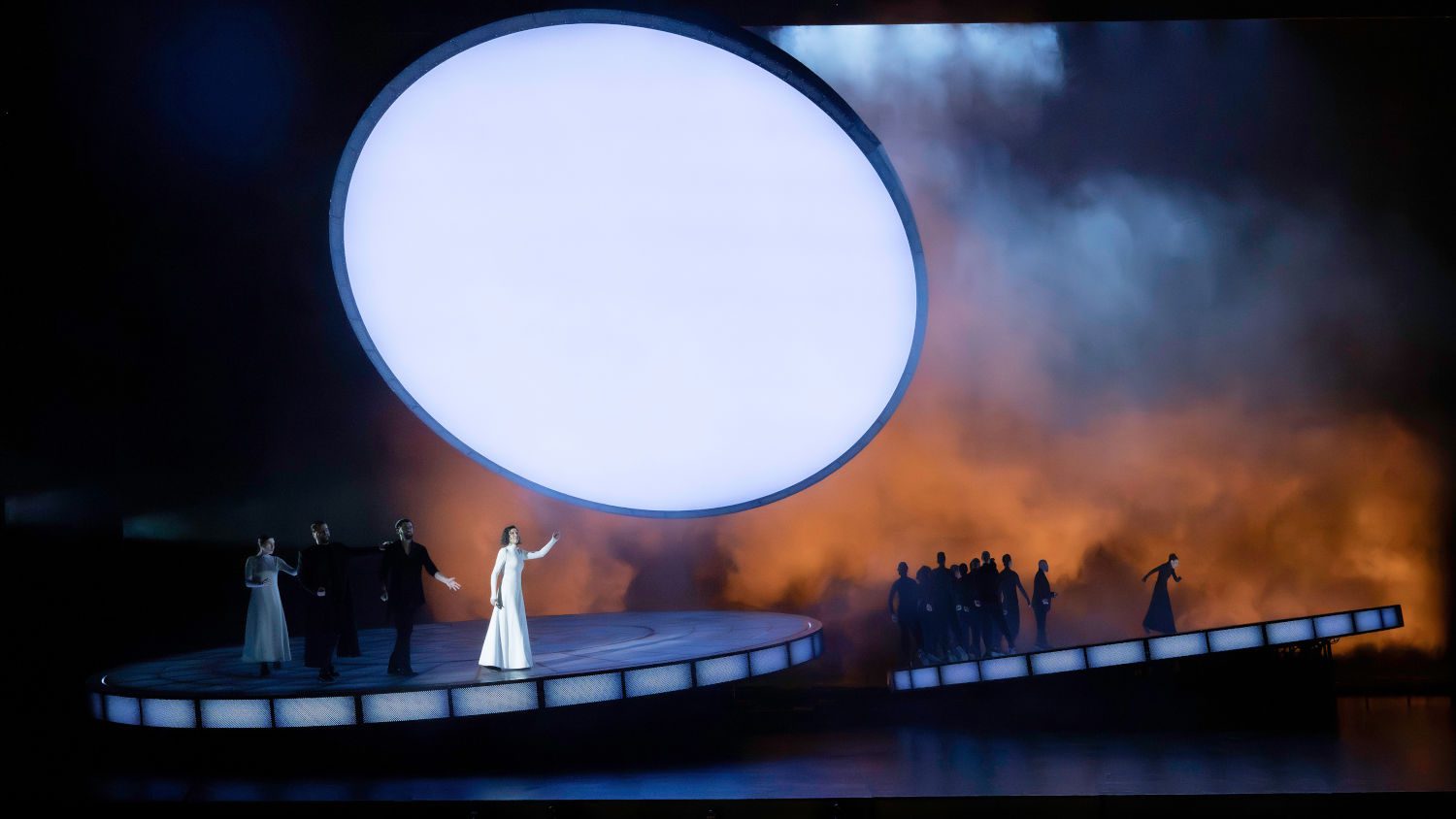 Im Duell der mächtigsten Monarchinnen des 16. Jahrhunderts lässt Regisseur Ulrich Rasche in seinem Bühnenbild zwei Riesenscheiben permanent rotieren, die die Rivalinnen um Liebe, den englischen Thron und grundsätzlich existenzielle Bedrohung repräsentieren. Für beide Frauen – und ihre Anhänger – ist es unmöglich, die Plattform der jeweils anderen zu betreten, wodurch die Distanz im Ringen um Religion, den rechtmäßigen Herrschaftsanspruch und die leidenschaftliche Zuneigung des Liebhabers auch physisch durchgehend erhalten bleibt. Beeindruckend wird mit Projektionen der schottischen Regentin auf einer dritten Scheibe – schwebend vom Schnürboden herab – gezeigt, dass die Abwesende für Elisabetta I. immer präsent ist. Auch wenn die beiden die meiste Zeit der Oper in getrennten Bildern auftreten: Stuardas Schatten schwebt bedrohlich über ihr. Gleichzeitig wirken die sich drehende Plattformen jeweils wie psychische und physische Gefangenschaften, aus denen nicht ausgebrochen werden kann. Beide Königinnen sind praktisch unablässig präsent, umgeben und manipuliert von Männergruppen.