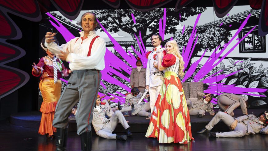 Die Geschichte um den Schweizer Hotelierssohn Bumerli, der in serbischer Uniform zwischen die Fronten gerät, packt Regisseur und Bühnenbildner Marcus Ganser in zwei poppige Buchdeckel, dazwischen comichafte Schwarz-Weiß-Videoprojektionen: ein stimmiges Gesamtkonzept. Den Kontrapunkt bilden die stilisierten, auf keine Epoche festgelegten, knallbunten und leicht karikaturesk angelegten Kostüme (Anna-Sophie Lienbacher). Einem Seiltänzer gleich schlängelt sich Gansers Regie so durch ein Meisterwerk der Gattung und trifft den ironischen Grad zwischen romantischer Heldenverklärung und subversivem Humor fast immer genau. Hie und da schießt er einen Millimeter übers Ziel hinaus, etwa dann, wenn Nadina den „Held ihrer Träume“ vor einer projizierten, monumentalen Heldenstatue und rotem Hintergrund besingen muss.