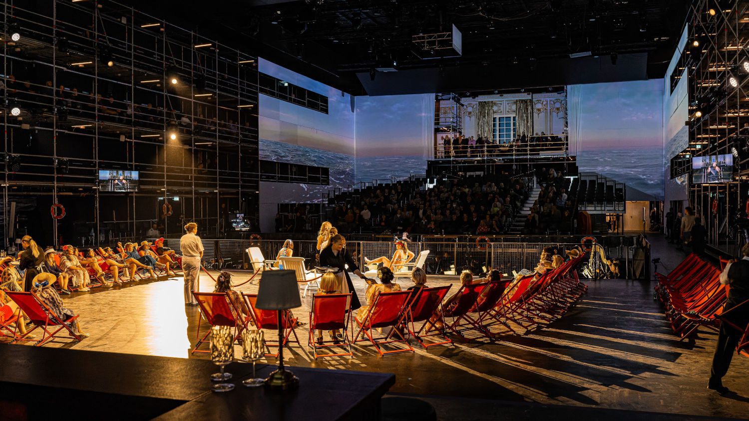 Verdis Oper spielt auf dem gleichnamigen Kreuzfahrtschiff. Chor und Statisten bevölkern auf Liegestühlen das Sonnendeck im Bühnenraum von Sebastian Hannak. Darunter sind auch einige Zuschauerinnen und Zuschauer – man kann „Adventure-Sitze“ an der Bar und im Restaurant buchen, geführte Ortswechsel durch „Crewmitglieder“ inbegriffen.