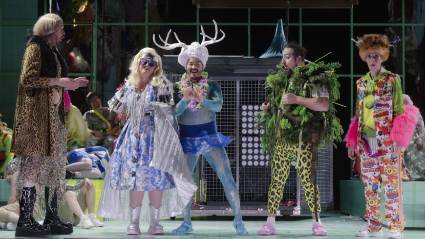Sir John Falstaff bricht am Staatstheater Augsburg im wahrsten Sinne des Wortes in das kleinkarierte, bürgerliche Windsor ein. Dessen spießige Trostlosigkeit zeigt sich schon während der Ouvertüre: das gekachelte Bühnenbild, die Männer in kariertem Grünton, die Frauen in gelben Kostümen im Stile der britischen Konservativen der 60er (Ausstattung: Lena Brexendorff). Eine Welt, die an ihrer eigenen Ordnung erstickt. Frau Fluth wie Frau Reich möchten raus aus dieser, ihrer Spießbürgerlichkeit. In einer Sänfte aus Plüsch und Lametta, mit Rüschen und glitzerndem Chaos, in Leoparden-Leggings und rosa Crocs tritt nun ihre Rettung auf. Falstaff ist in Christian Poewes Inszenierung kein Bacchant, sondern vielmehr ein komischer Vogel: bunt, laut, deplatziert. Er muss sich in dieser Welt nicht beweisen oder selbst aktiv werden; sein bloßes Auftreten genügt, um sie in Bewegung zu setzen.