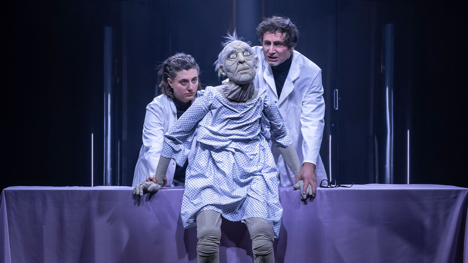 Seit 70 Monaten kommt Mrs. D. in die Klinik. Sie findet keinen Weg mehr zu ihrem im Denken und Reagieren offenbar verstummten Mann. Dieser ist eine von Marieke Chinow gebaute Kopfgriff-Puppe in Fast-Lebensgröße und die einzige Sprechrolle unter Gesangspartien. Christoph Levermann spricht dessen kurze Sätze kantig, Seth Cardillo-Tietze führt die Puppe. Ausgerechnet die namenlose Tochter der Pflegerin knackt die abgesunkene Psyche D.s und bringt diese zum leisen, doch hoffnungsvollen Schwingen. Anna Maria Schmidt spielt mit einem längst der Schuluniform entwachsenen Leuchten, das Langer mit Spitzentönen fütterte. Kai Anne Schuhmacher zeigt in ihrer Regie später die nach außen erkennbare Innenwelt D.s mit einer karnevalesken Verwandlung aller Figuren. Dieses Intermezzo wirkt wie ein bizarrer Kindergeburtstag am falschen Ort.