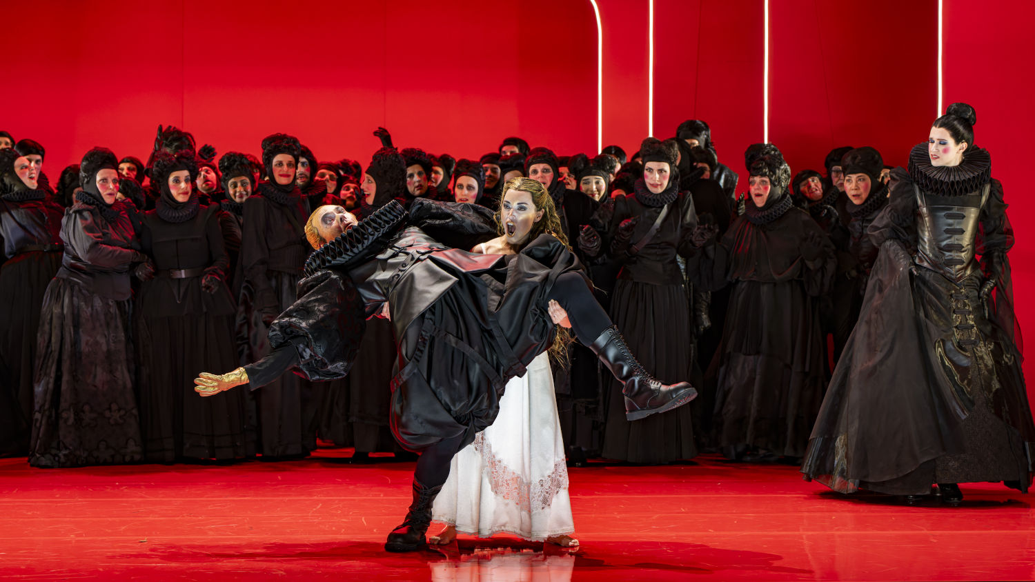 Macbeth trägt wie fast alle anderen ein opulentes schwarzes Kostüm – mit Pluderhose, Wams und Riesenkragen. Iain MacNeil bewältigt nicht nur alle körperlichen Herausforderungen wie Radschlagen mit größter Souveränität, sondern glänzt auch mit seinem durchdringenden, metallisch gefärbten Bariton. Heather Engebretson, als Einzige ganz in Weiß, fasziniert mit enormer Bühnenpräsenz und beweglichem, vielschichtigem Sopran – ihre Lady Macbeth wird zur Sympathieträgerin. Sam Carl gibt einen bassmächtigen Banco, Rolf Romei einen Macduff mit blödem Fransenpony und tenoraler Wucht. Am Ende wird der trottelige, ständig seine Krone verlierende Malcom (Ervin Ahmeti) zum König gekrönt und das Volk fällt zur Siegeshymne in Ohnmacht. Ob das noch was wird in Schottland?